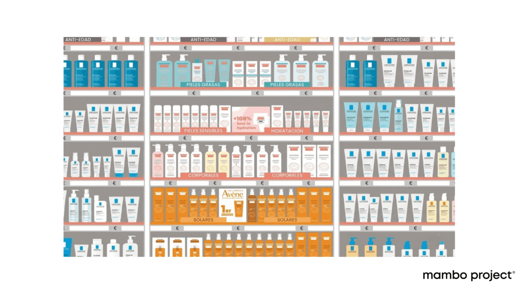 - Cuando se acerca, ve la mancha de color de la marca. Reconoce visualmente su marca de confianza — Vichy, La Roche-Posay, Isdin — y se dirige hacia ella de forma instintiva.